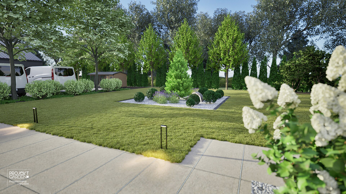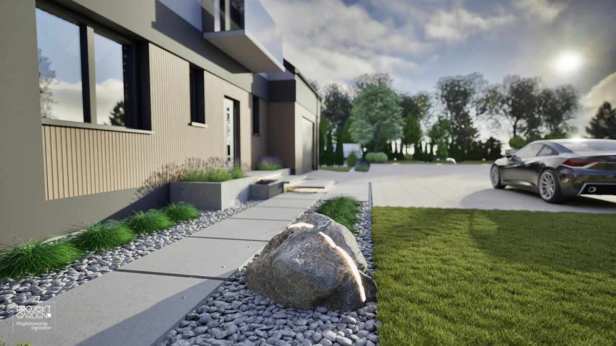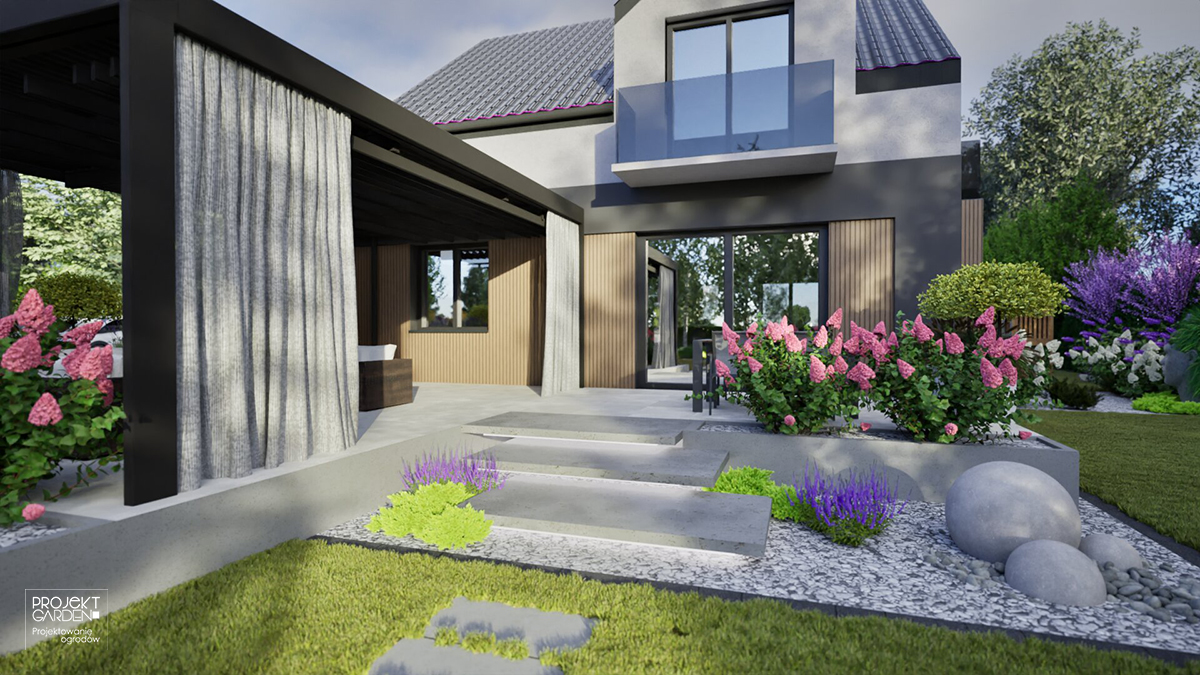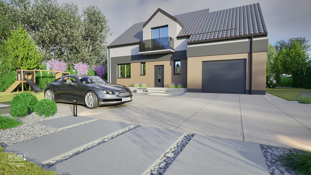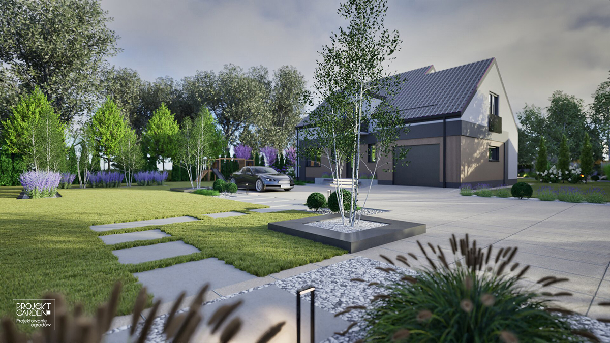 Ten projekt obejmuje kompleksowe zagospodarowanie przestrzeni wokół domu, z naciskiem na funkcjonalność i estetykę. Na działce znalazły się wszystkie elementy, które sprawiają, że ogród staje się miejscem codziennego relaksu – od reprezentacyjnej strefy frontowej, przez taras z pergolą, aż po naturalny zakątek w brzozowym lasku.