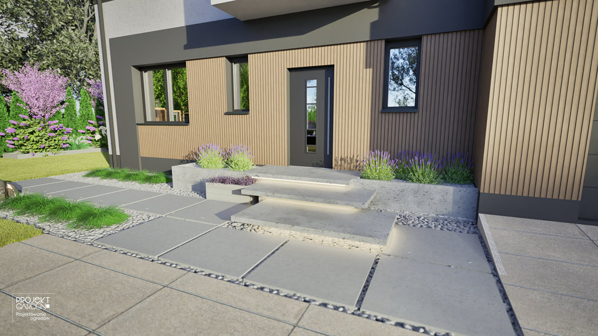 Wejście do domu podkreślają lewitujące, podświetlane schody oraz wielkoformatowe płyty betonowe, które tworzą spójną i elegancką nawierzchnię.