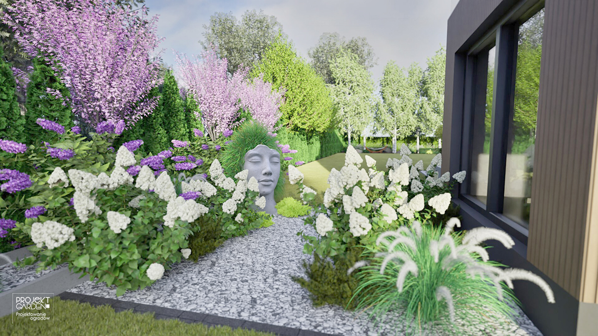 Otoczenie uzupełnia zróżnicowana zieleń – trawy ozdobne, rośliny zimozielone, kwitnące krzewy i szczepione drzewka, dzięki którym ogród jest atrakcyjny przez cały rok.