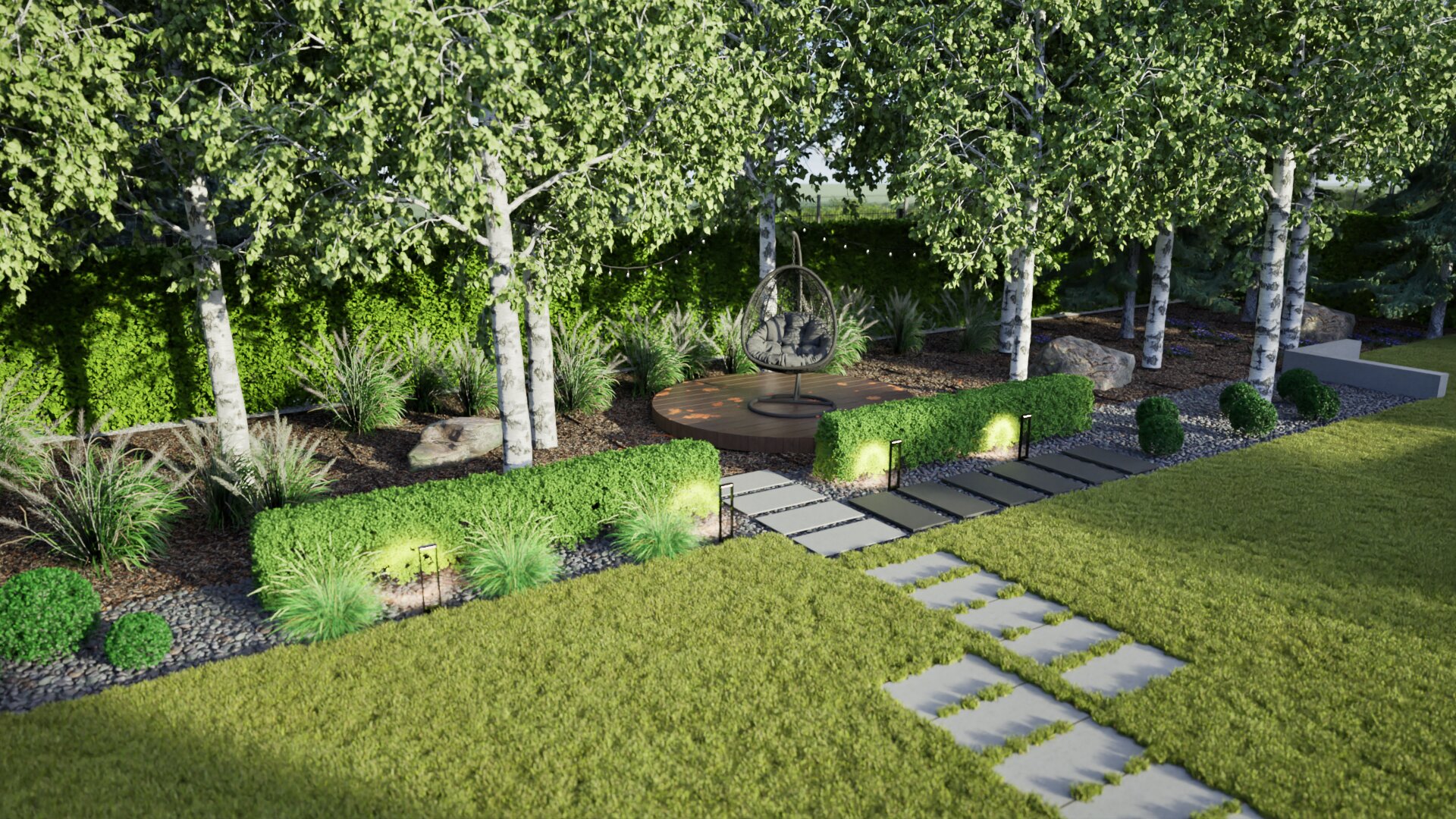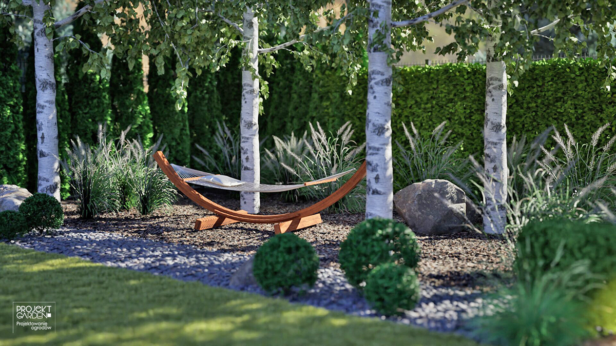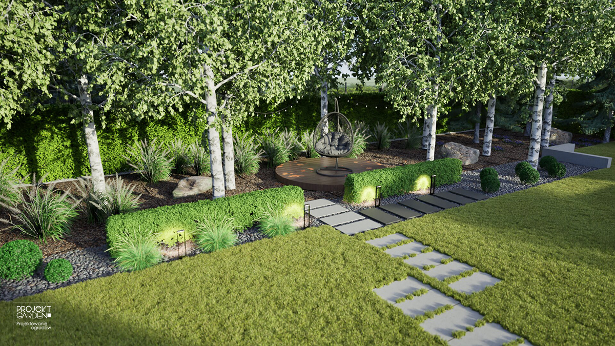 W tylnej części działki zaplanowano kameralny lasek brzozowy z drewnianym podestem – idealnym na kokon, hamak czy leżaki. To naturalna strefa relaksu w cieniu drzew.