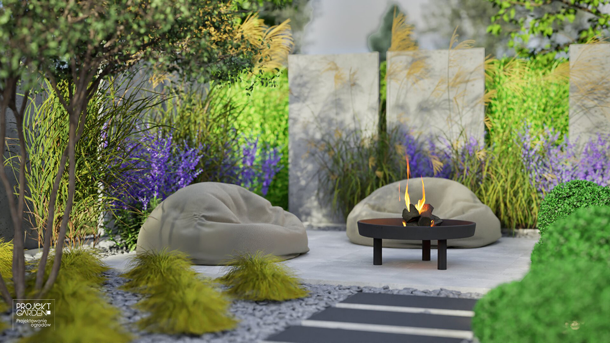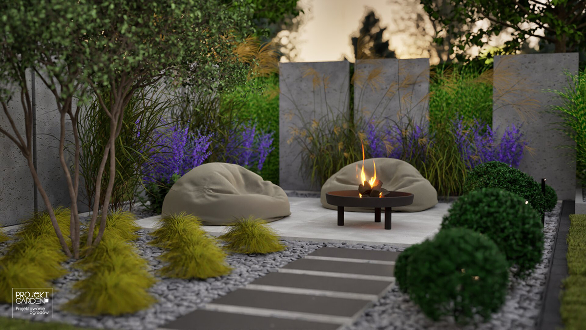 W ogrodzie znalazła się także strefa paleniska, oddzielona betonowymi elementami – idealne miejsce na wieczorne spotkania w gronie bliskich.
