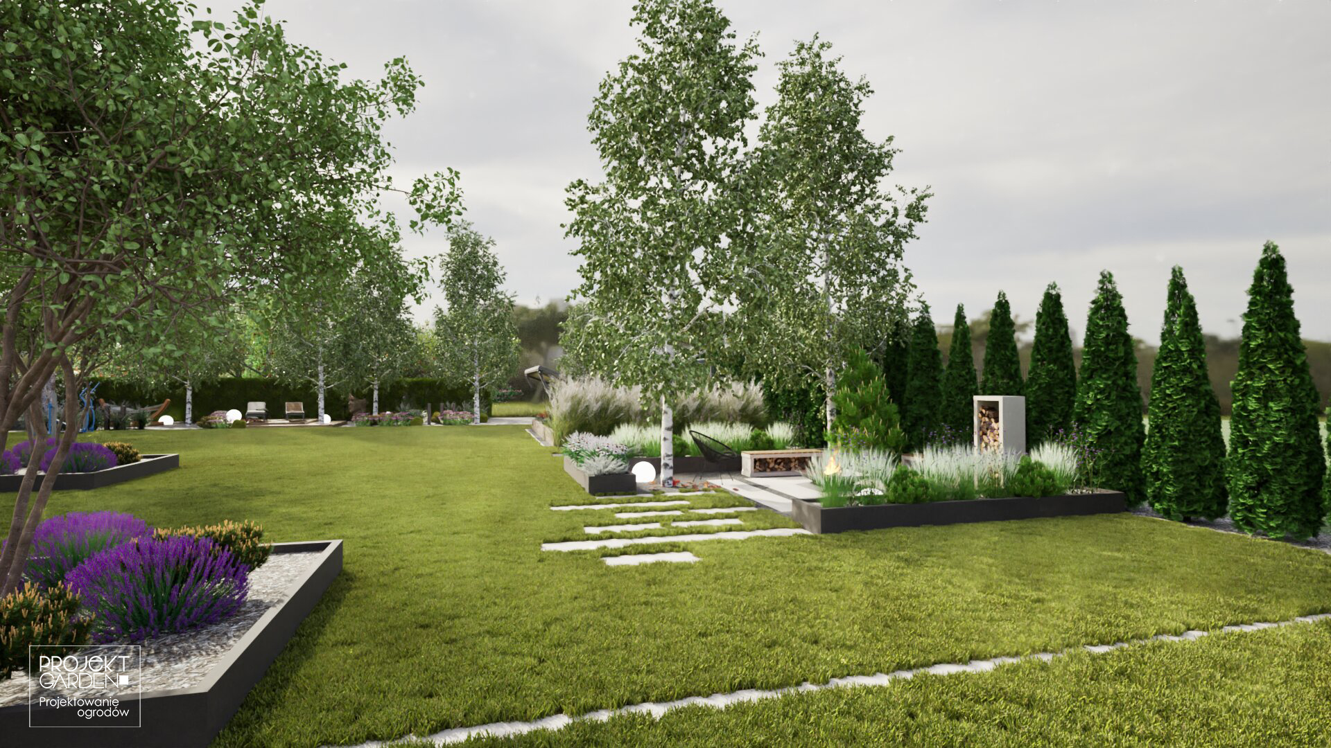 Przy ścieżkach: lawenda, trawy ozdobne, hortensje, miskanty, kolumnowe graby.