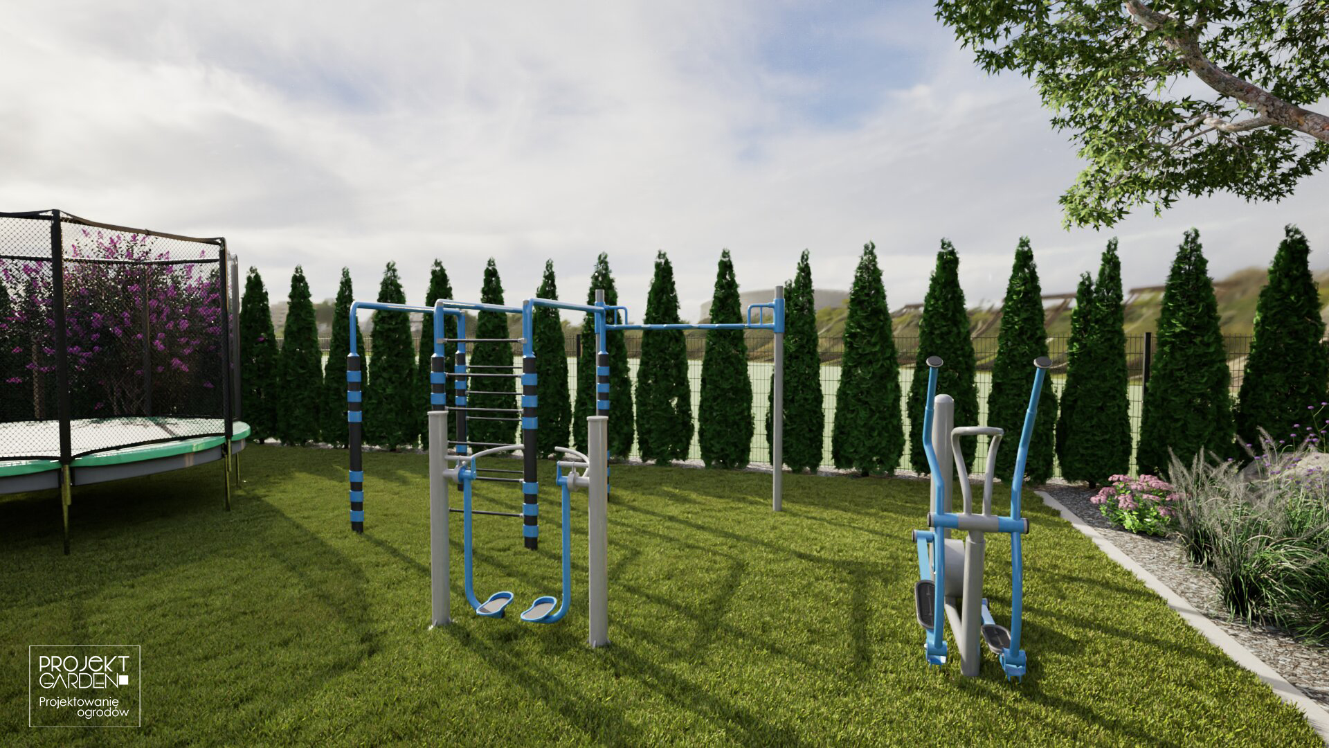 Strefa sportowa i użytkowa – trampolina, siłownia, warzywnik, szklarnia.