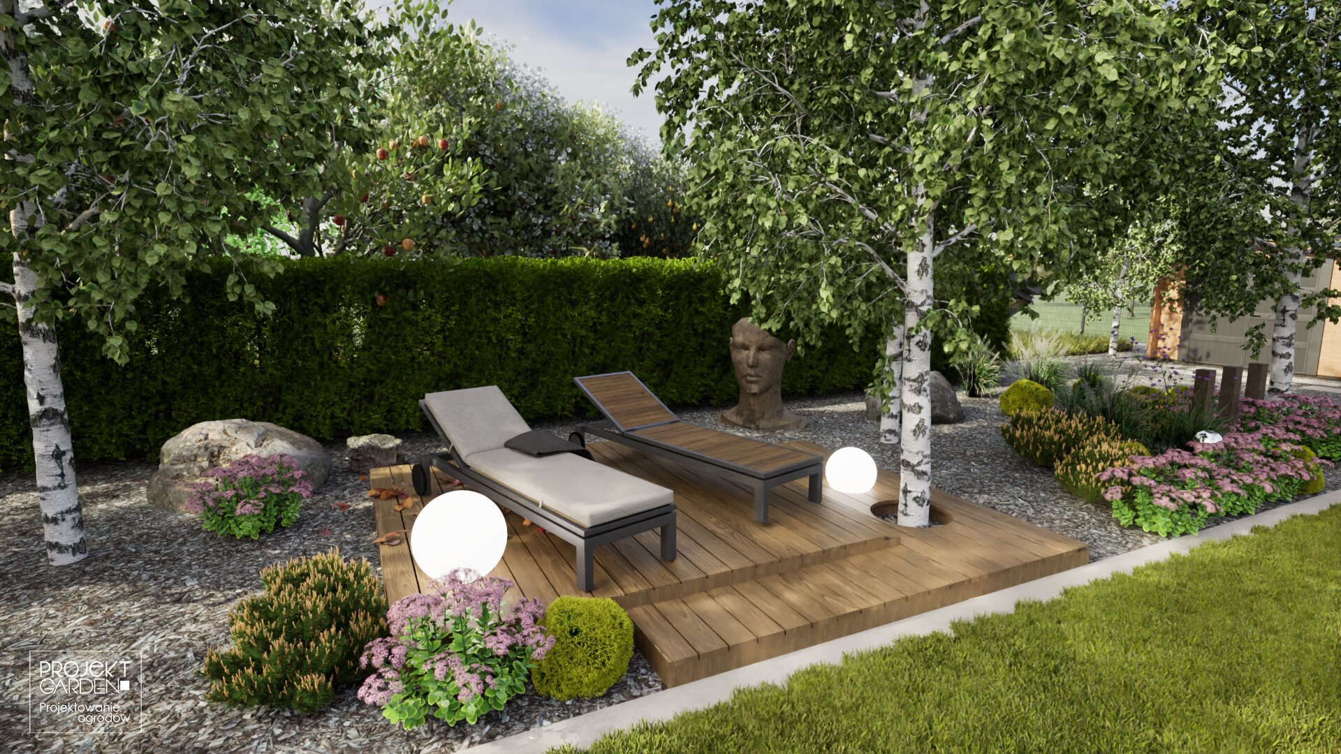 Strefa leśna – brzozowy zagajnik, platan, podest z hamakiem i leżakami.