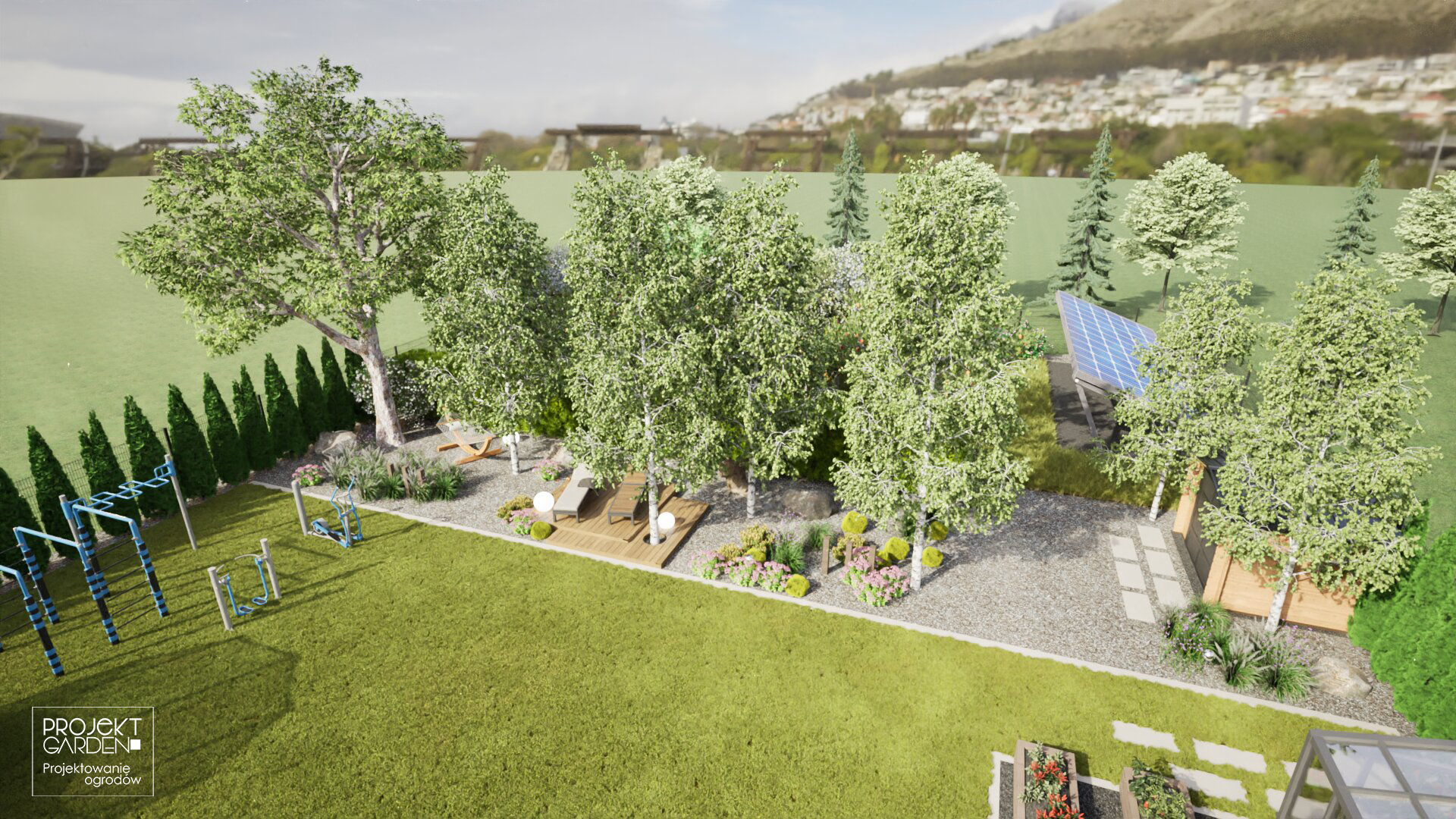 Mini sad i łąka – drzewa owocowe, panele fotowoltaiczne, awaryjna brama.