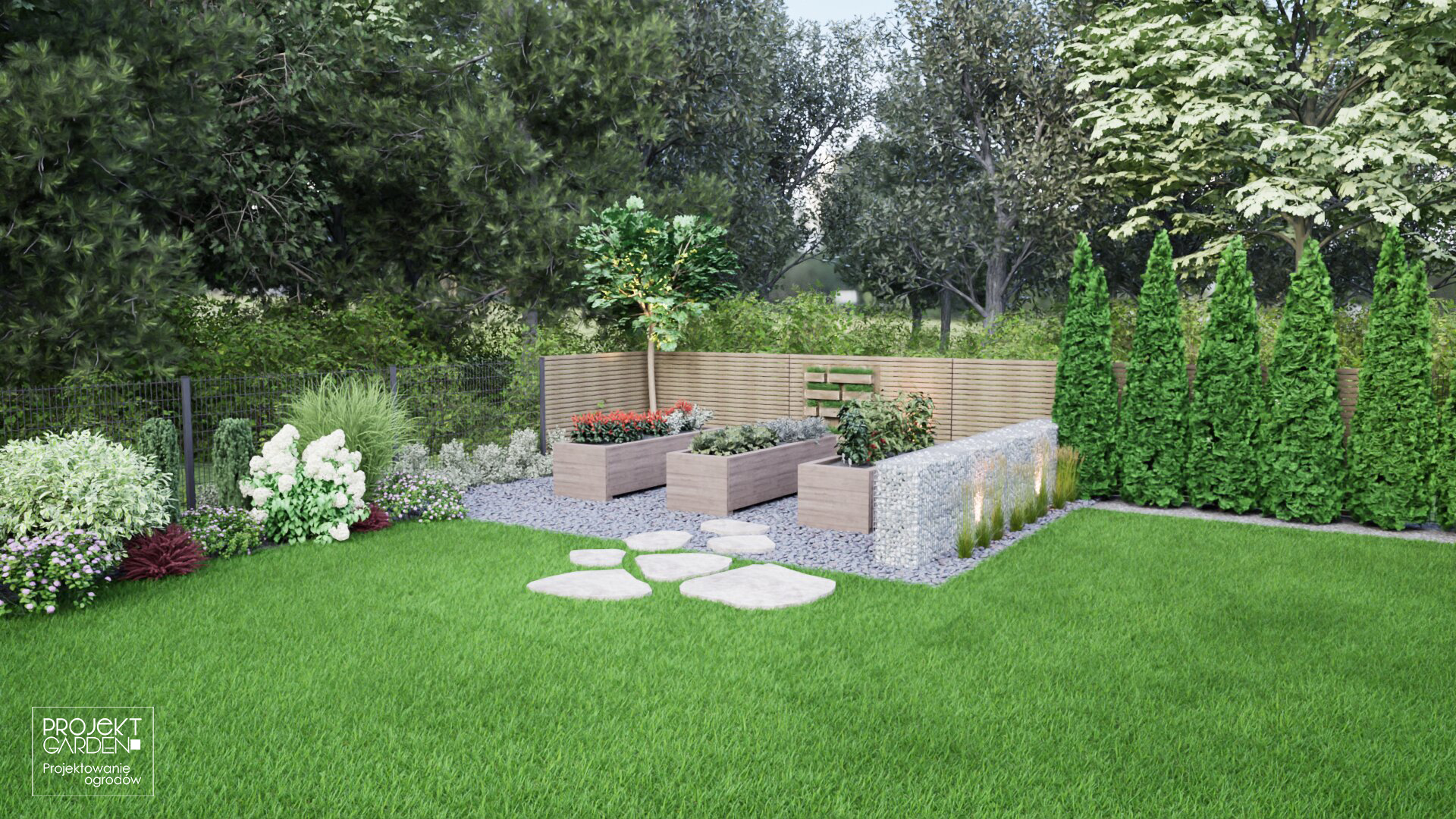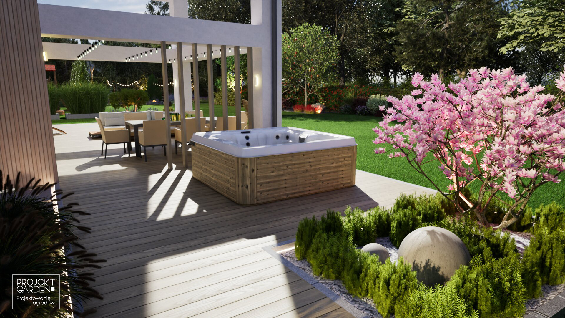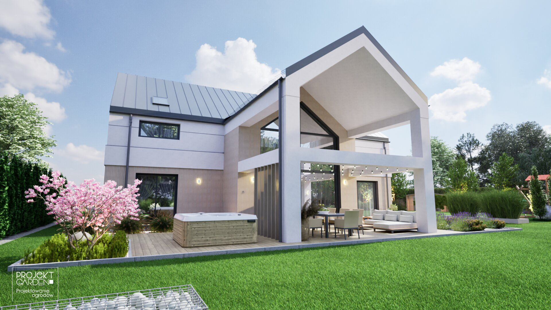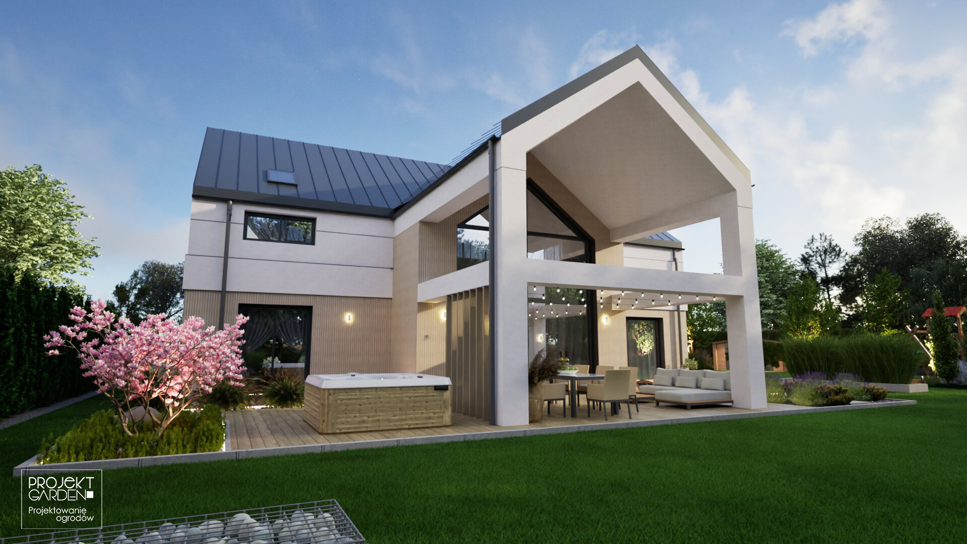 Z tyłu domu rozciąga się obszerny taras, podzielony funkcjonalnie na trzy strefy: jacuzzi, część jadalno-wypoczynkową oraz strefę relaksu z leżakami. Wkomponowane w taras donice z roślinnością uzupełniają kompozycję, nadając jej lekkości i przytulności. Nie zabrakło też miejsca na uporządkowany warzywnik w skrzyniach otoczonych gabionami, strefę zabaw dla dzieci oraz subtelne oświetlenie LED, które po zmroku podkreśla klimat i strukturę całego ogrodu.