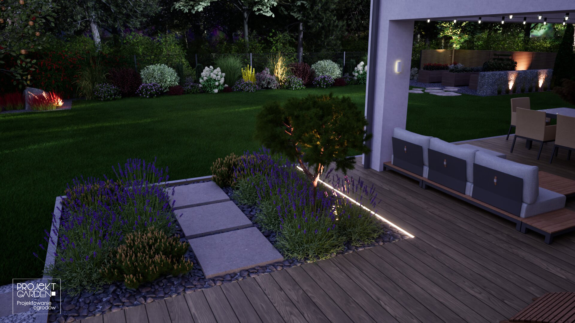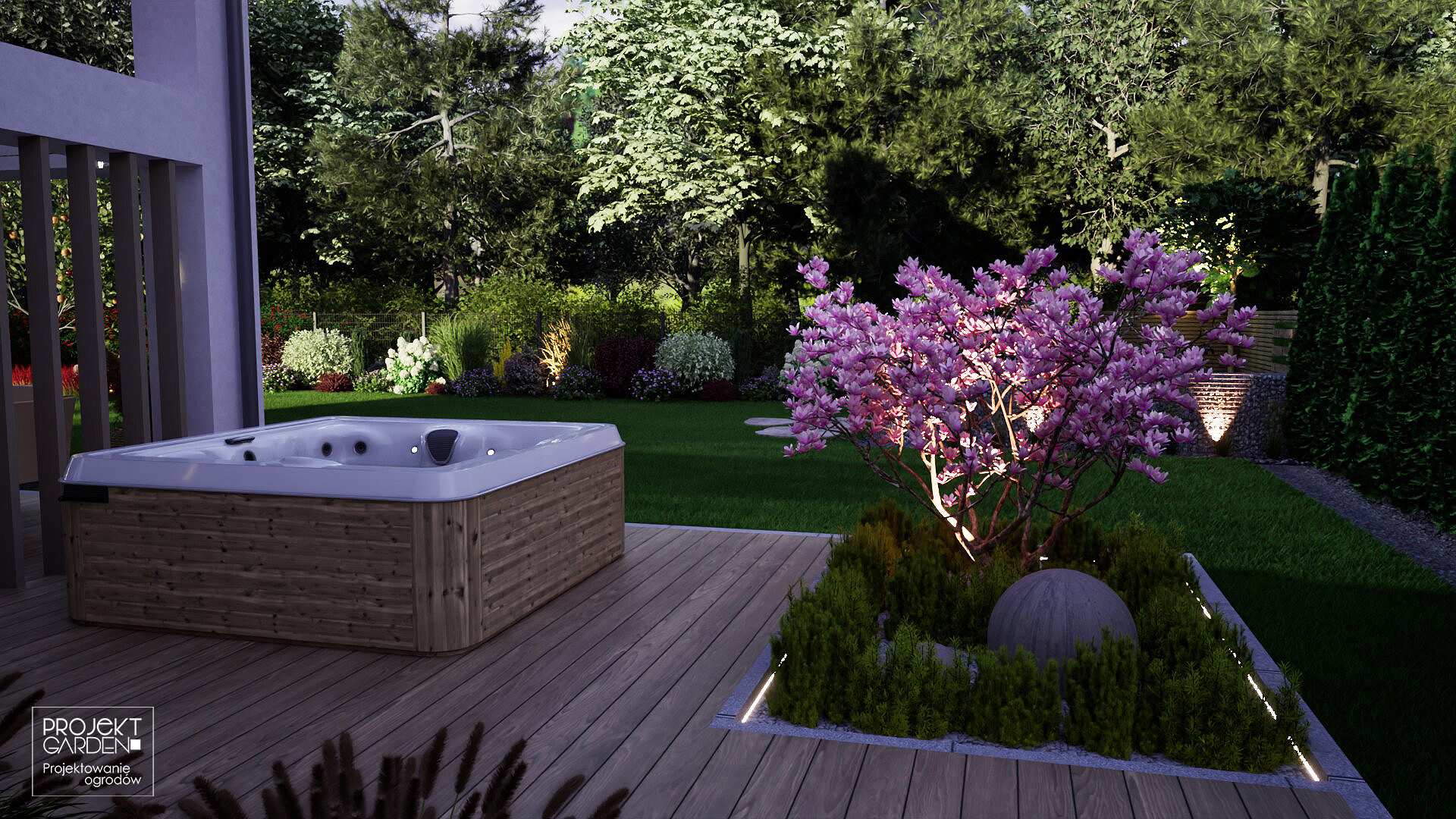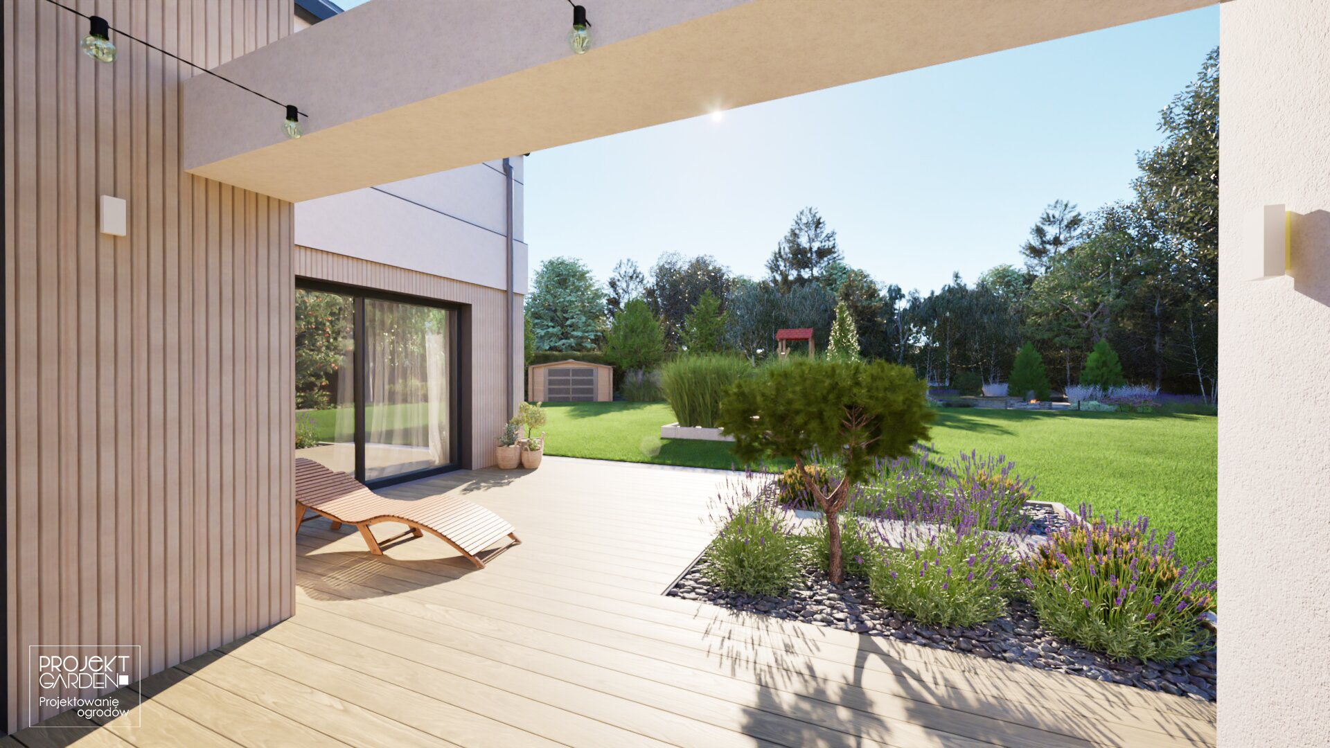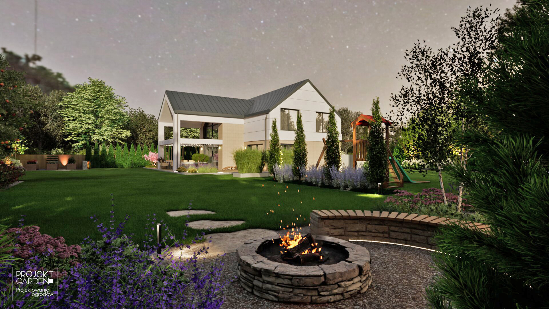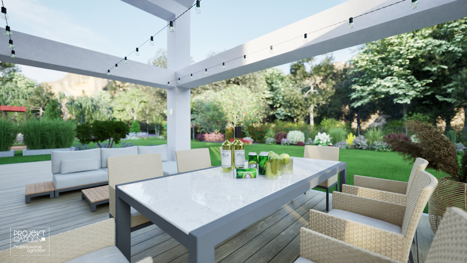 Z tyłu domu rozciąga się obszerny taras, podzielony funkcjonalnie na trzy strefy: jacuzzi, część jadalno-wypoczynkową oraz strefę relaksu z leżakami. Wkomponowane w taras donice z roślinnością uzupełniają kompozycję, nadając jej lekkości i przytulności. Nie zabrakło też miejsca na uporządkowany warzywnik w skrzyniach otoczonych gabionami, strefę zabaw dla dzieci oraz subtelne oświetlenie LED, które po zmroku podkreśla klimat i strukturę całego ogrodu.