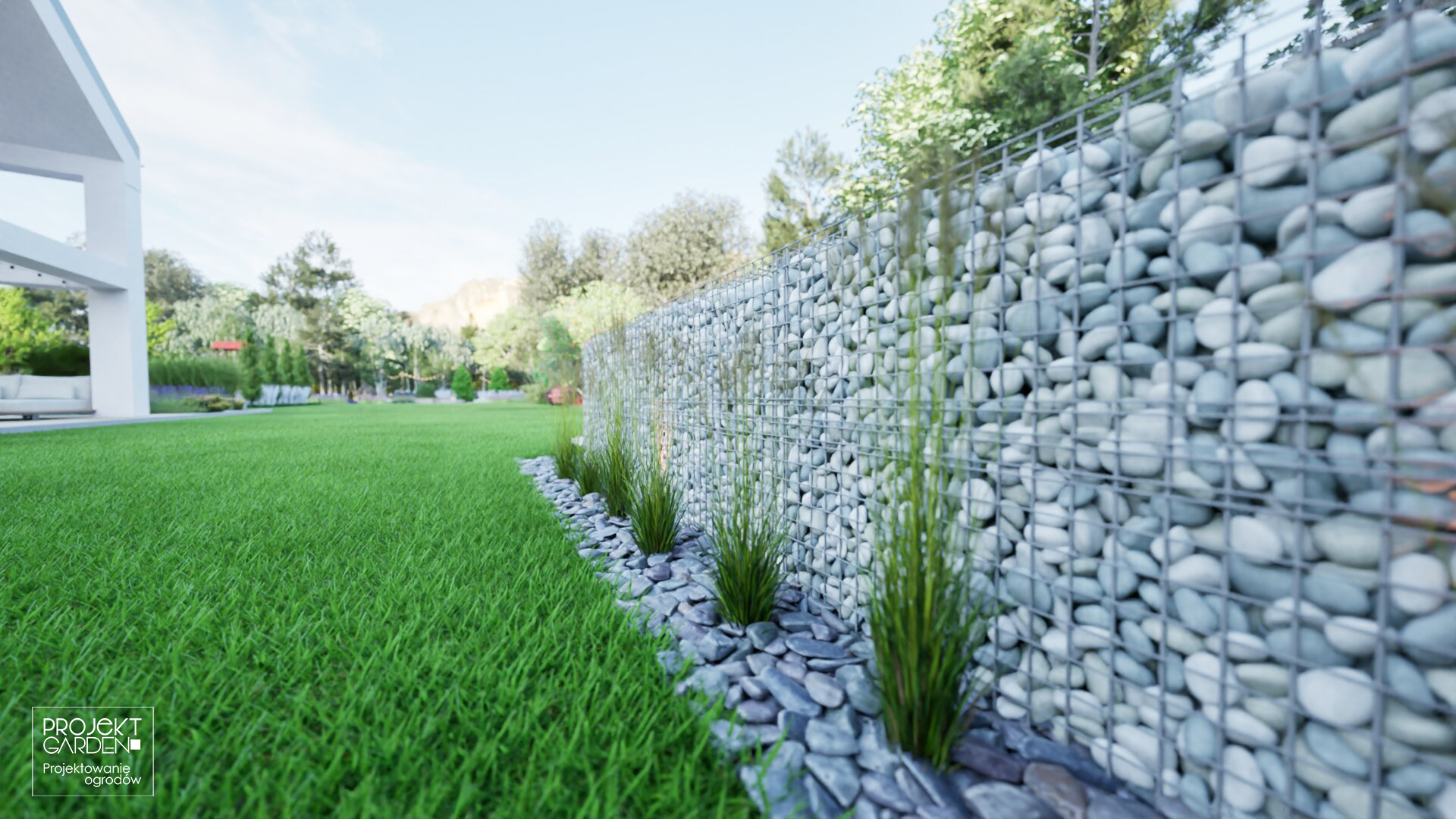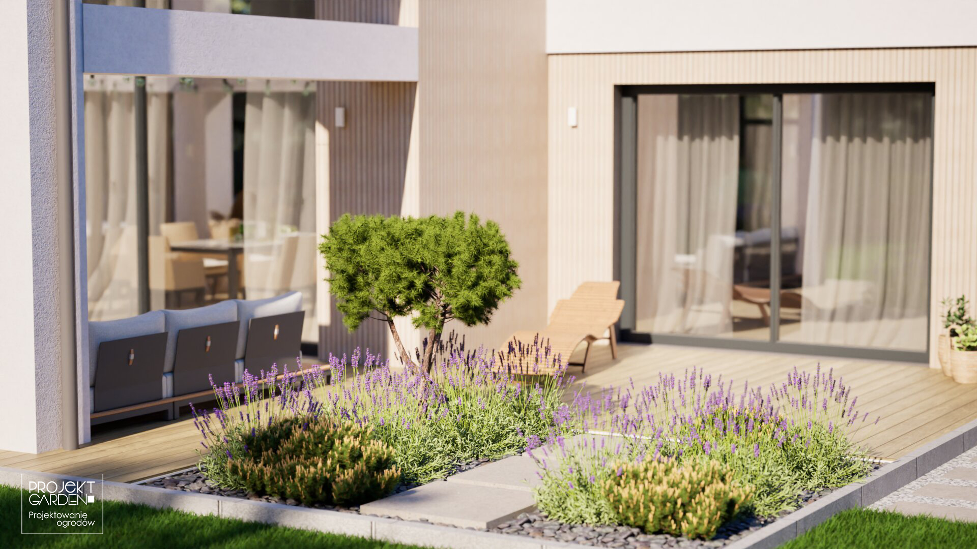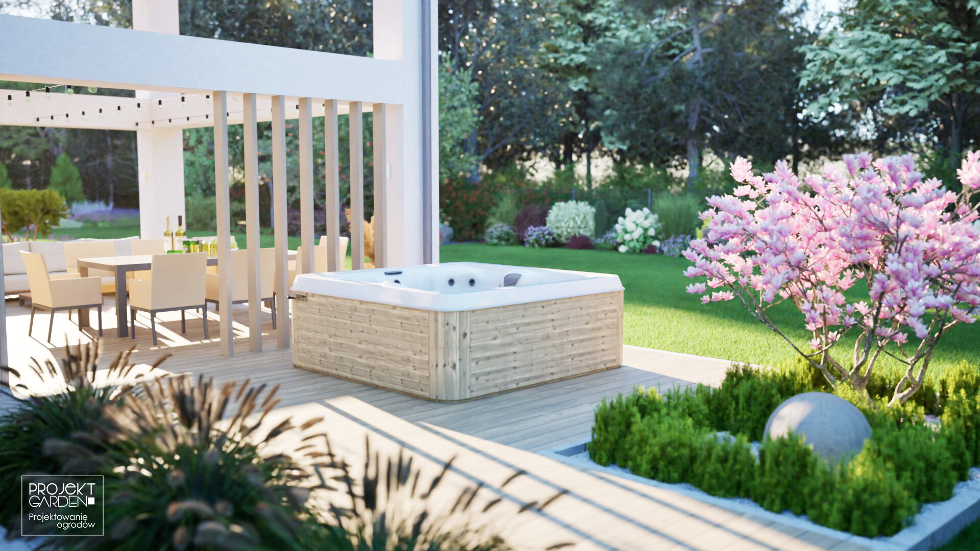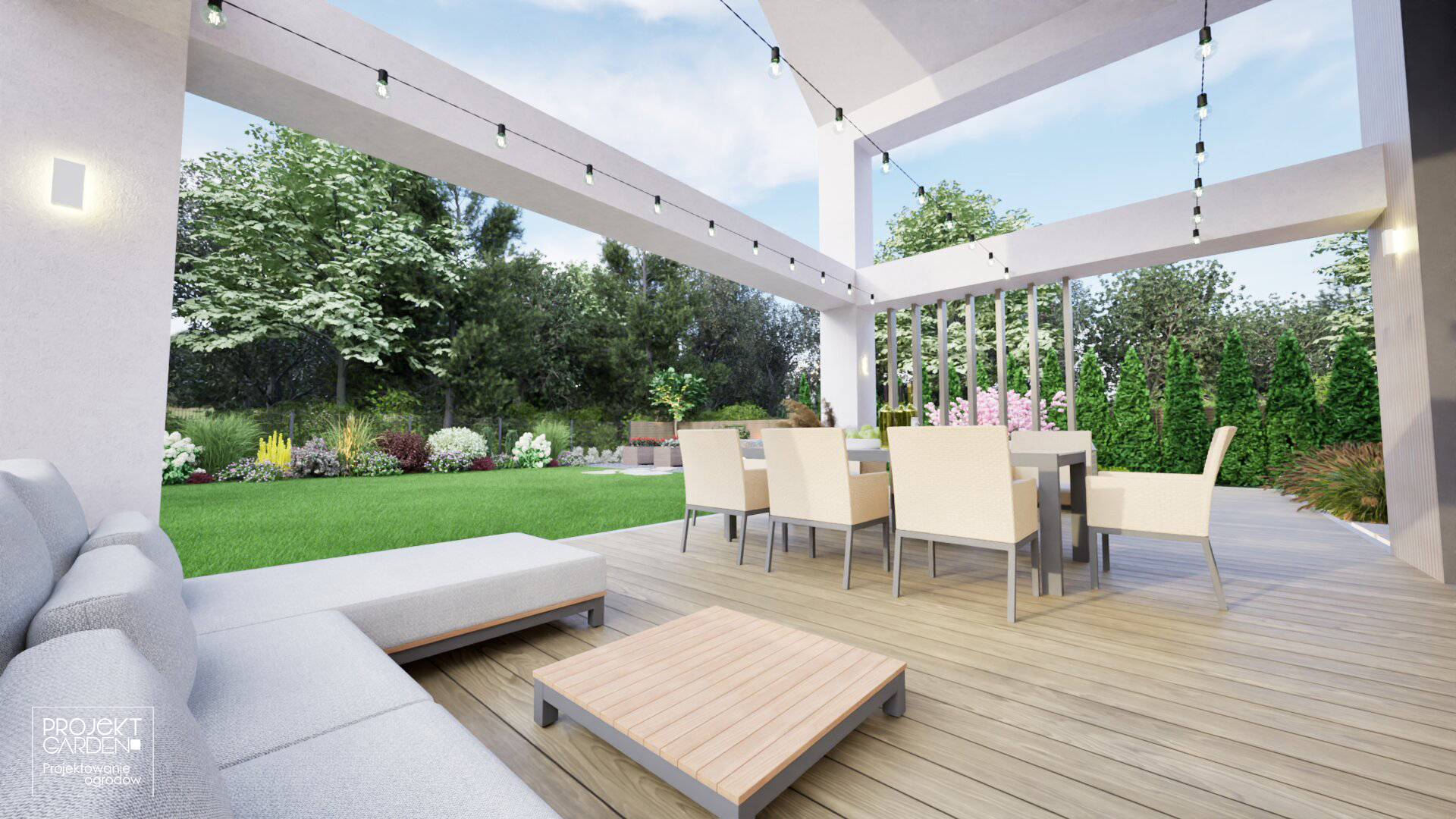 Z tyłu domu rozciąga się obszerny taras, podzielony funkcjonalnie na trzy strefy: jacuzzi, część jadalno-wypoczynkową oraz strefę relaksu z leżakami. Wkomponowane w taras donice z roślinnością uzupełniają kompozycję, nadając jej lekkości i przytulności. Nie zabrakło też miejsca na uporządkowany warzywnik w skrzyniach otoczonych gabionami, strefę zabaw dla dzieci oraz subtelne oświetlenie LED, które po zmroku podkreśla klimat i strukturę całego ogrodu.