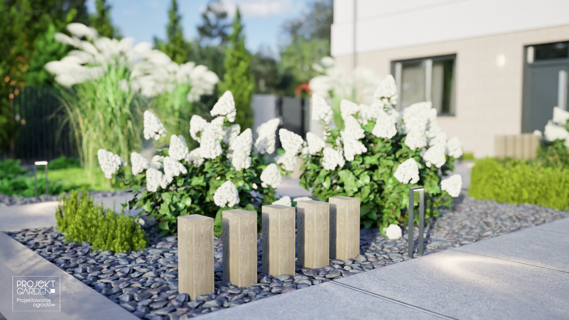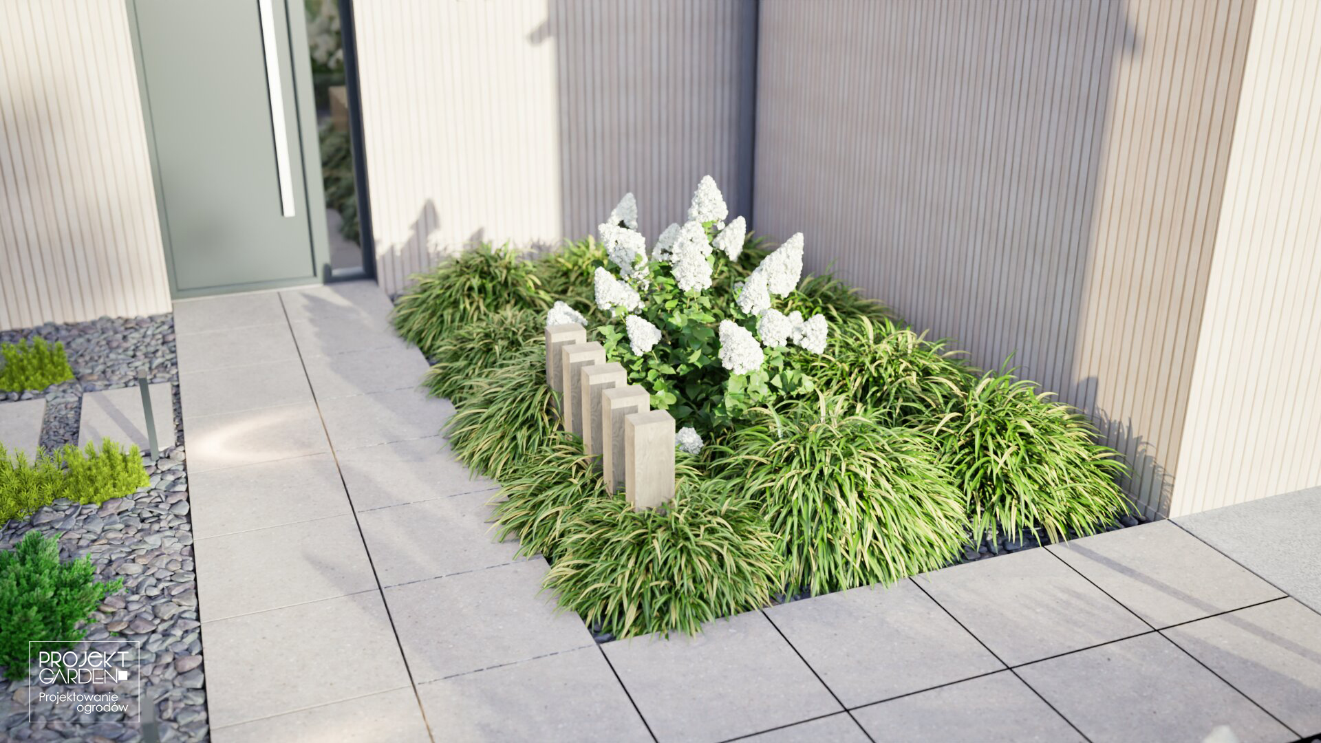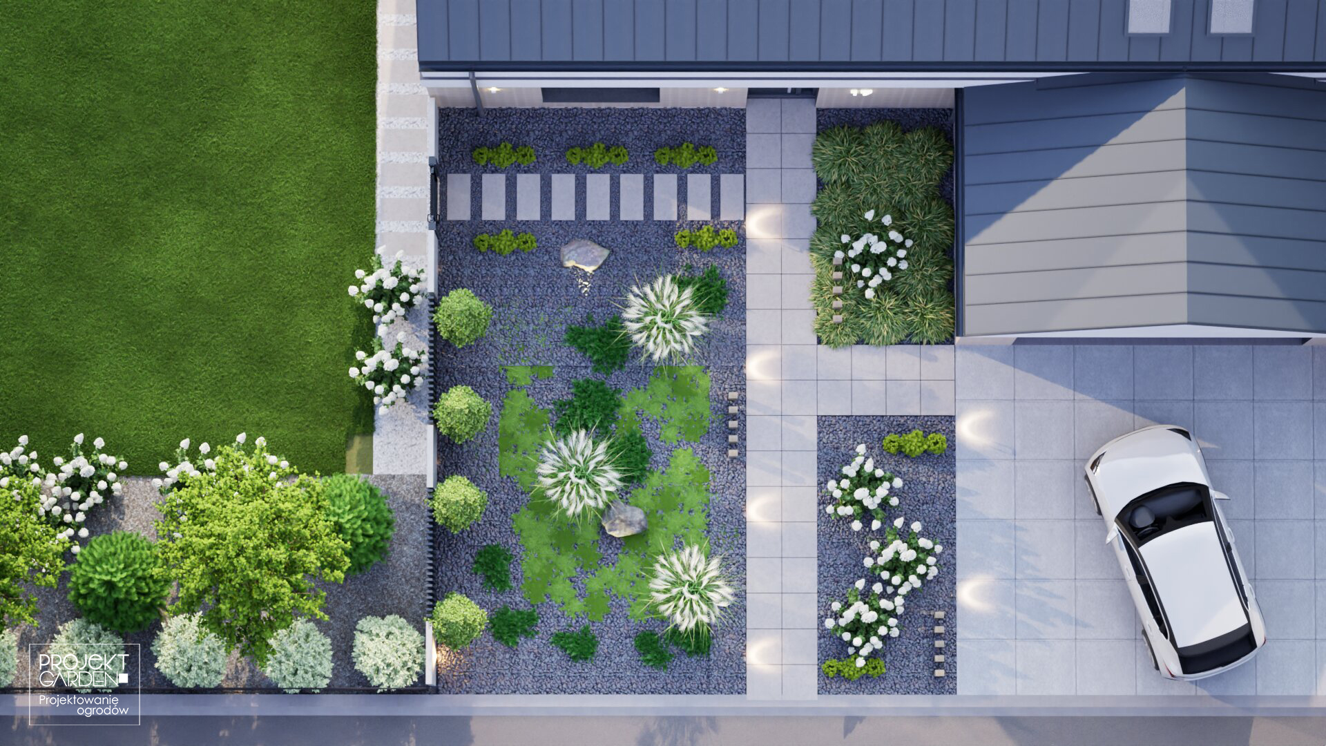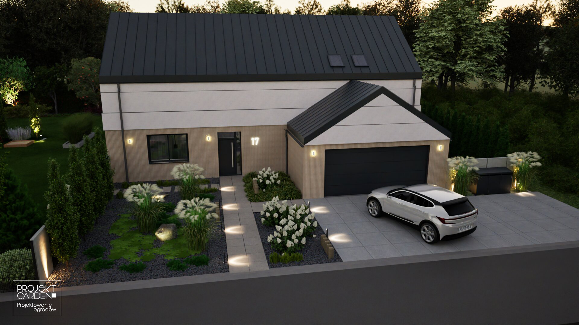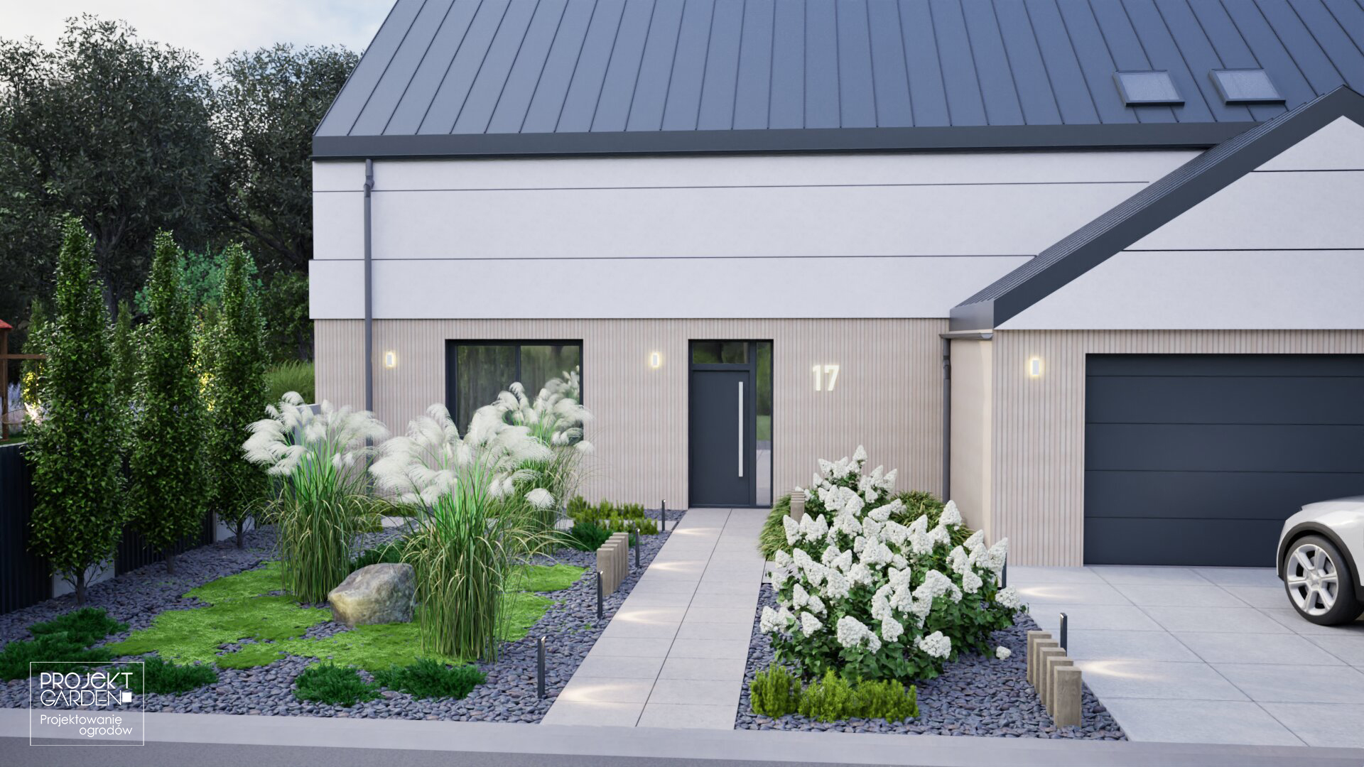 Front działki został zaprojektowany w duchu minimalizmu – otwarty i uporządkowany, z wielkoformatowymi płytami betonowymi ułatwiającymi manewrowanie samochodem. Nasadzenia dobrano tak, aby były efektowne przez cały rok, a jednocześnie nie wymagały intensywnej pielęgnacji. Przeważają rośliny zimozielone, dzięki którym przestrzeń pozostaje zielona i uporządkowana o każdej porze roku.