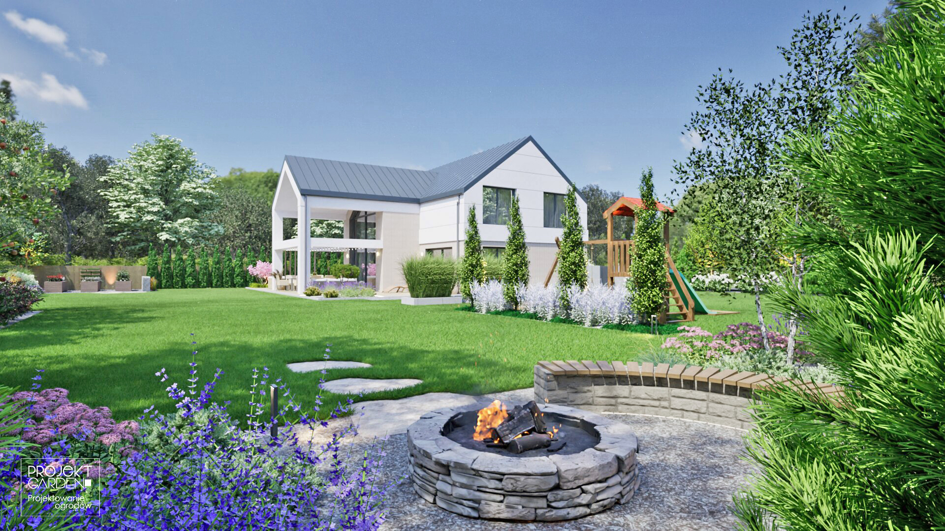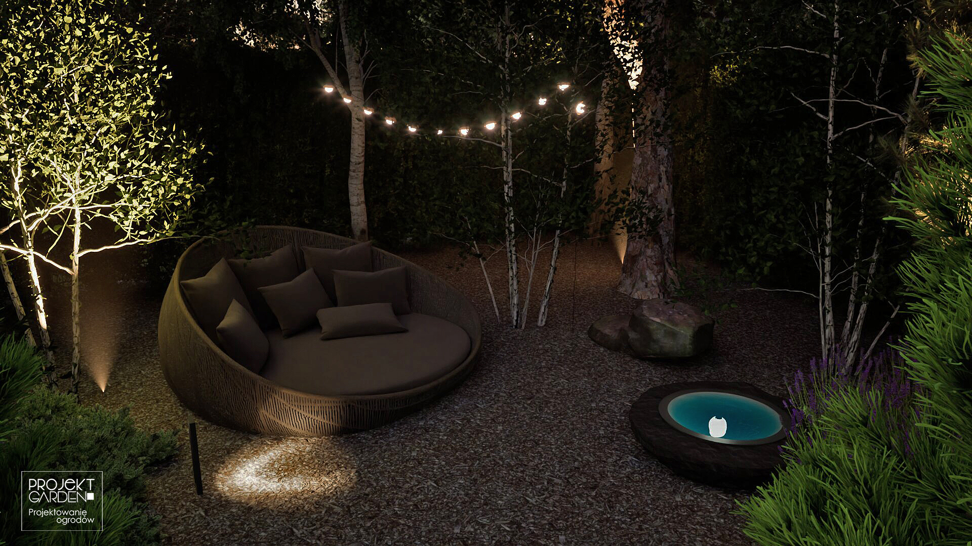 W dalszej części ogrodu znajduje się brzozowy zagajnik, w którym pomiędzy drzewami i bylinami zaplanowano kameralne miejsce z paleniskiem i półokrągłą ławką – idealne na wieczory przy ogniu. Obok powstała zaciszna strefa relaksu z łóżkiem ogrodowym i misą wodną, tworząca spokojną przestrzeń do wypoczynku blisko natury.